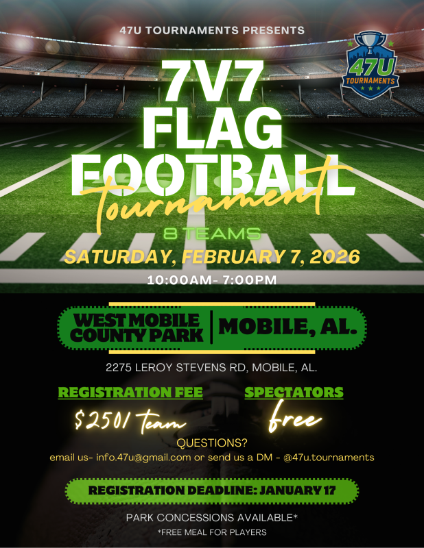 The next 47U flag football tournament will be Saturday, Feb. 7, 2026, from 10 a.m. to 7 p.m. at West Mobile County Park. Registration