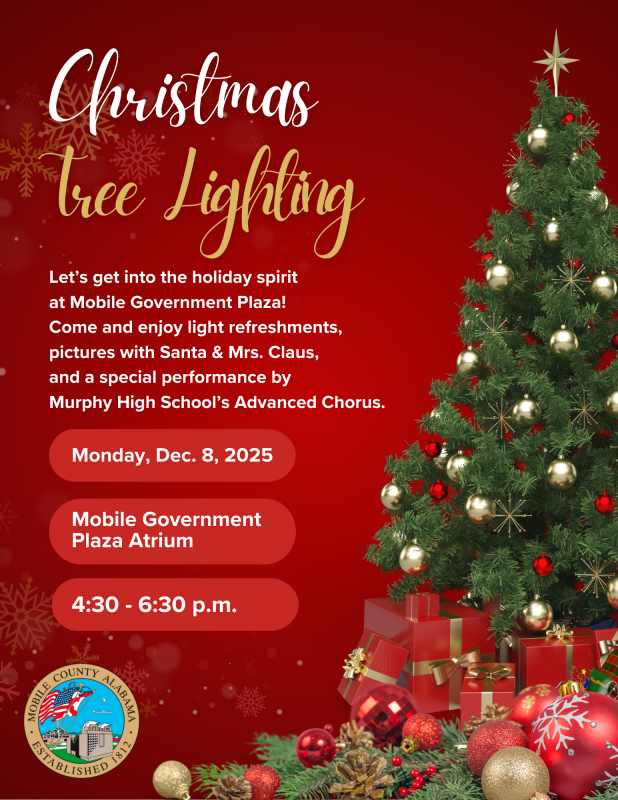 The Mobile County Commission presents the Government Plaza Tree-Lighting Celebration on Monday, Dec. 8, from 4:30 to 6 p.m. in the