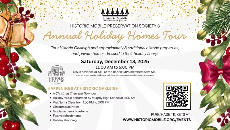 The Historic Mobile Preservation Society's Annual Holiday Homes Tour will take place on Saturday, Dec. 13, from 11 a.m. to 5 p.m.