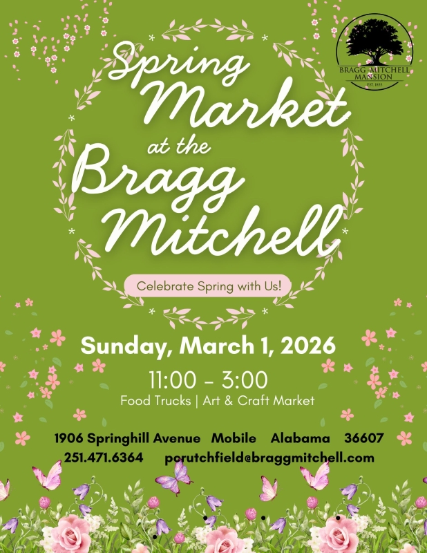 Celebrate the arrival of spring at the FREE Spring Market on Sunday, March 1, from 11 a.m. to 3 p.m. at the Bragg-Mitchell Mansion. Shop for
