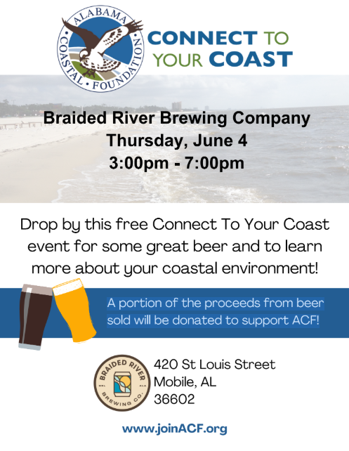 The Alabama Coastal Foundation will host a FREE Connect To Your Coast event on Thursday, June 4, from 3 to 7 p.m. at Braided River Brewing Co.