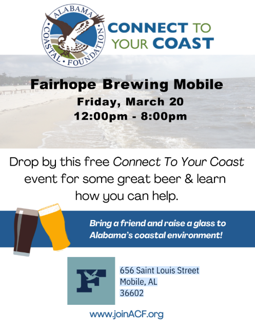 The Alabama Coastal Foundation will host a FREE Connect To Your Coast event on Friday, March 20, from noon to 8 p.m. at Fairhope Brewing Mobile.