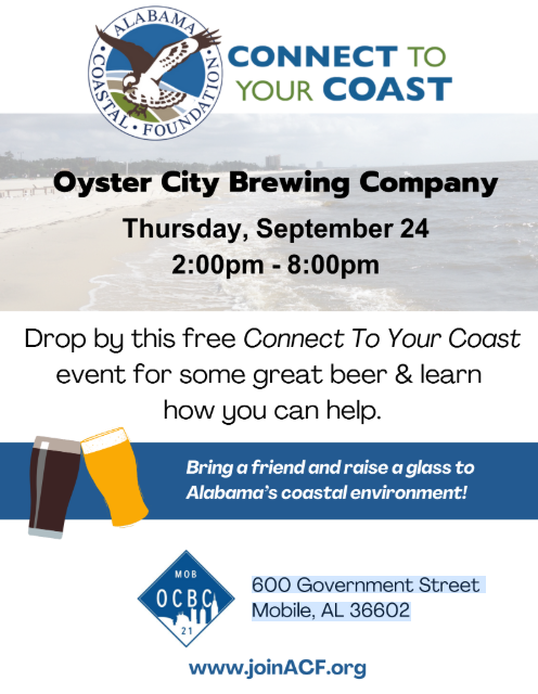The Alabama Coastal Foundation will host a FREE Connect To Your Coast event on Thursday, Sept. 24, from 2 to 8 p.m. at Oyster City Brewing Co.