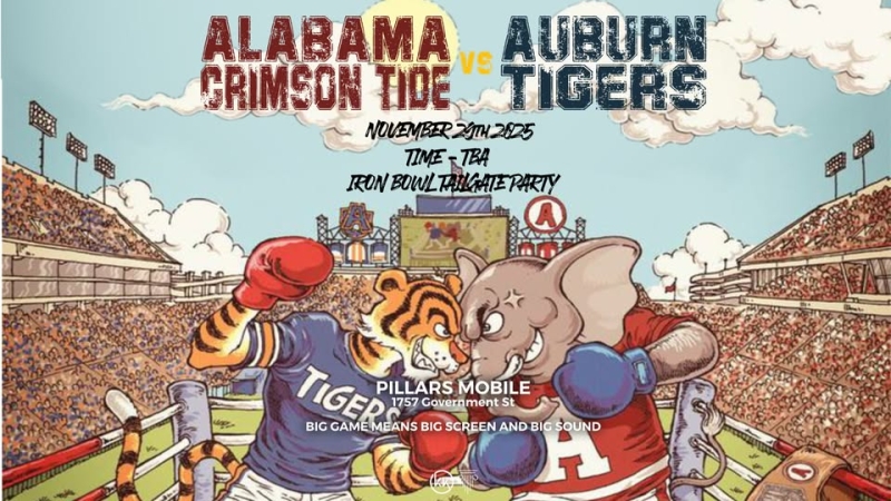 Bring the tailgate vibes to the Iron Bowl Tailgate Watch Party on Saturday, Nov. 29, at 11 a.m. at The Pillars Mobile. There will be a giant LED