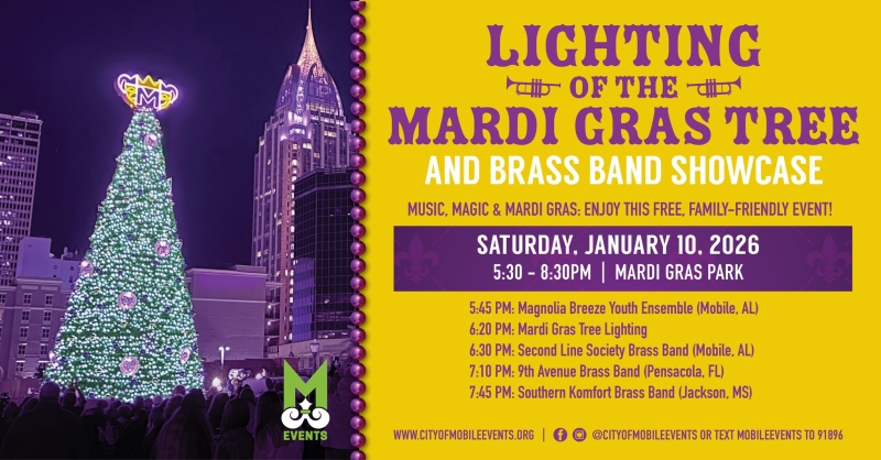 The FREE, spectacular Lighting of the Mardi Gras Tree and Brass Band Showcase will take place Saturday, Jan. 10, from 5:30 to 8:30 p.m. in Mardi Gras