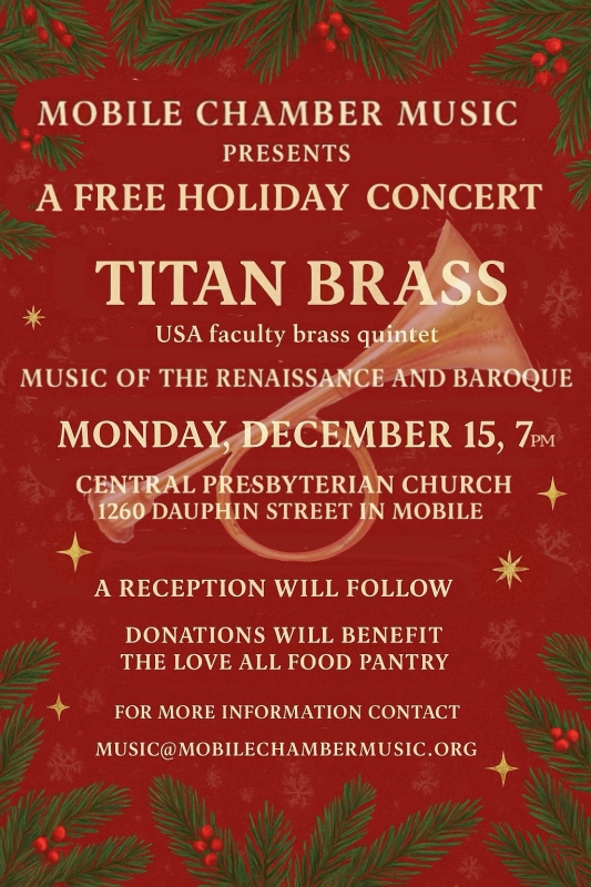 Mobile Chamber Music presents a FREE concert from Titan Brass, the USA faculty brass quintet, on Monday, Dec. 1, at 7 p.m. at Central
