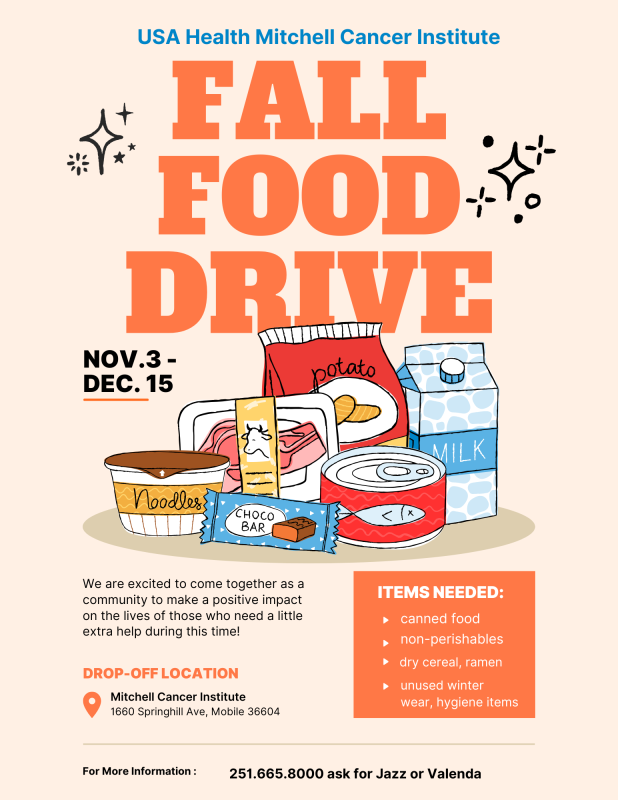 USA Health Mitchell Cancer Institute is hosting a fall food drive to help benefit cancer patients and the surrounding community this holiday season