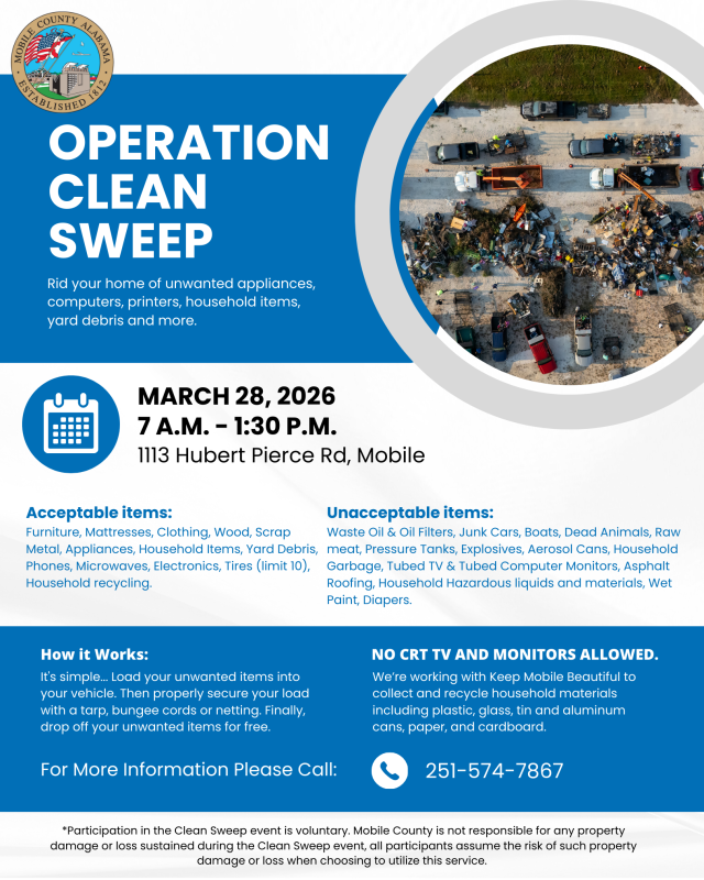 Mobile County residents can clean out and dispose of unwanted household appliances, computers, printers, household items, bagged leaves, yard debris