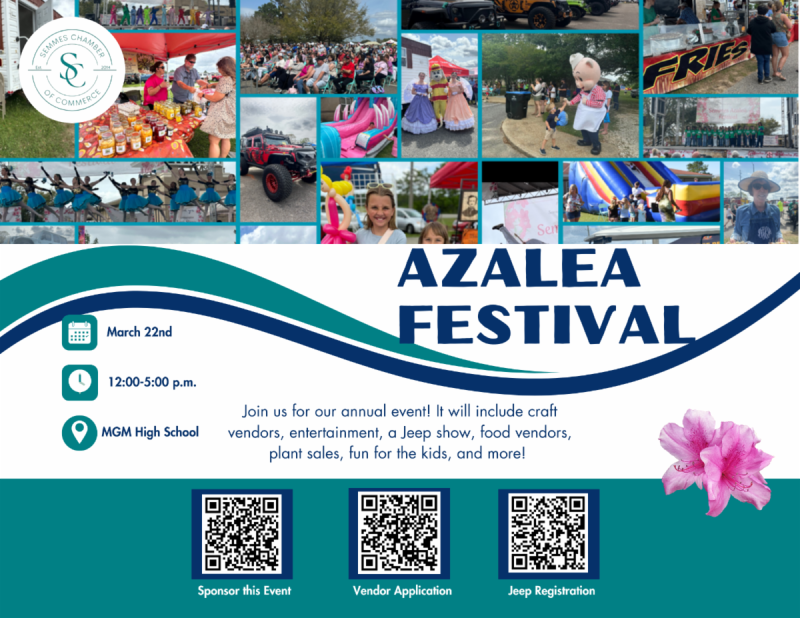 The Semmes Chamber of Commerce presents its annual Azalea Festival on Sunday, March 22, from noon to 5 p.m. at Mary G. Montgomery High School. This