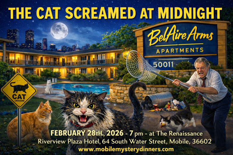 Mobile Mystery Dinners presents The Cat Screamed at Midnight on Saturday, Feb. 28, from 7 to 10 p.m. at the Renaissance Riverview Plaza Hotel. This