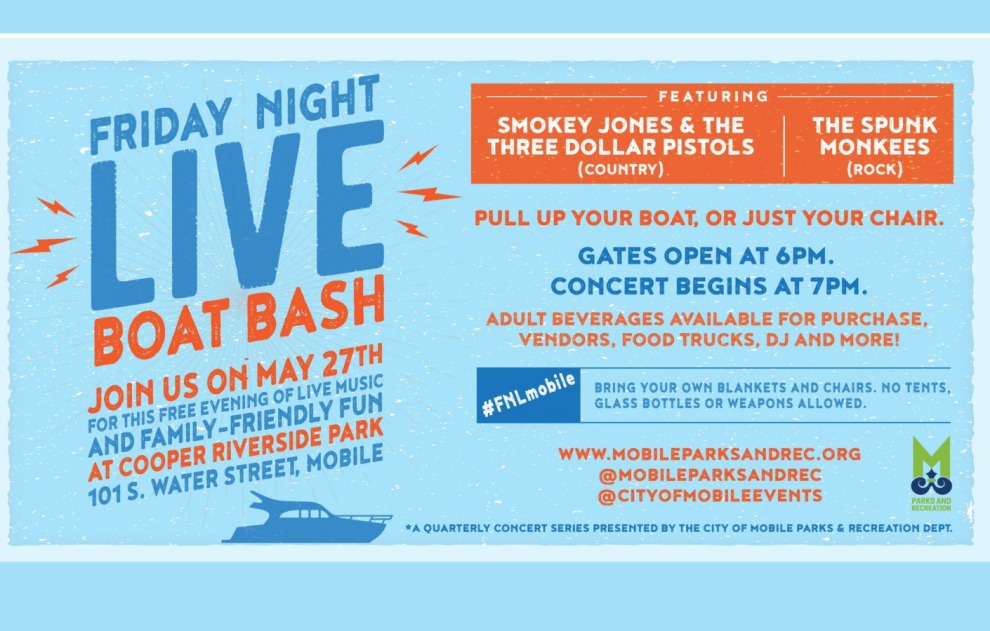 Join the City of Mobile Parks and Recreation Department for Friday Night Live May 27, 2022, from 6:00 p.m. to 11 p.m. for a FREE evening of live music, food trucks, and family-friendly fun at Cooper Riverside Park. Pull up your boat, or just your chair, and enjoy Live Music in the Park! Performing live will be Smokey Jones & The Three Dollar Pistols and The Spunk Monkees. Bring your own blankets and chairs. No tents, glass bottles, or weapons are allowed. Friday Night Live is a quarterly concert series presented by the City of Mobile Parks and Recreation Department