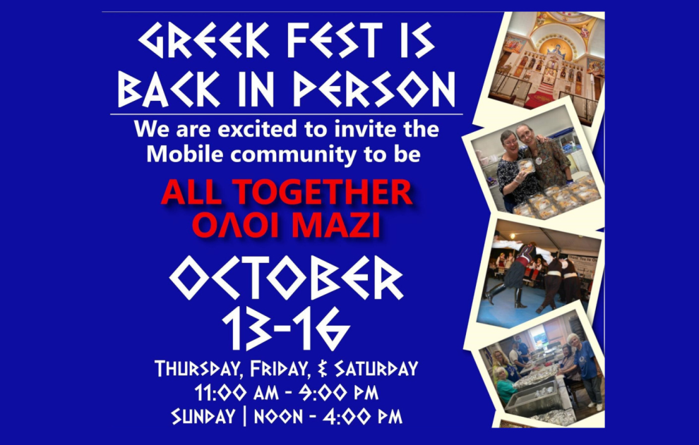 The Annunciation Greek Orthodox Church welcomes you to Greek Fest and back in person for 2022! Come out and enjoy A Taste of Greece, Oct. 13 through 16, 2022. The Mobile Greek Festival has been a staple of the community since the first Greek Night in 1962. There will be church tours, Greek dance shows, live music, and of course delicious pastries! To learn more and view the menu visit https://greekfestmobile.com/
