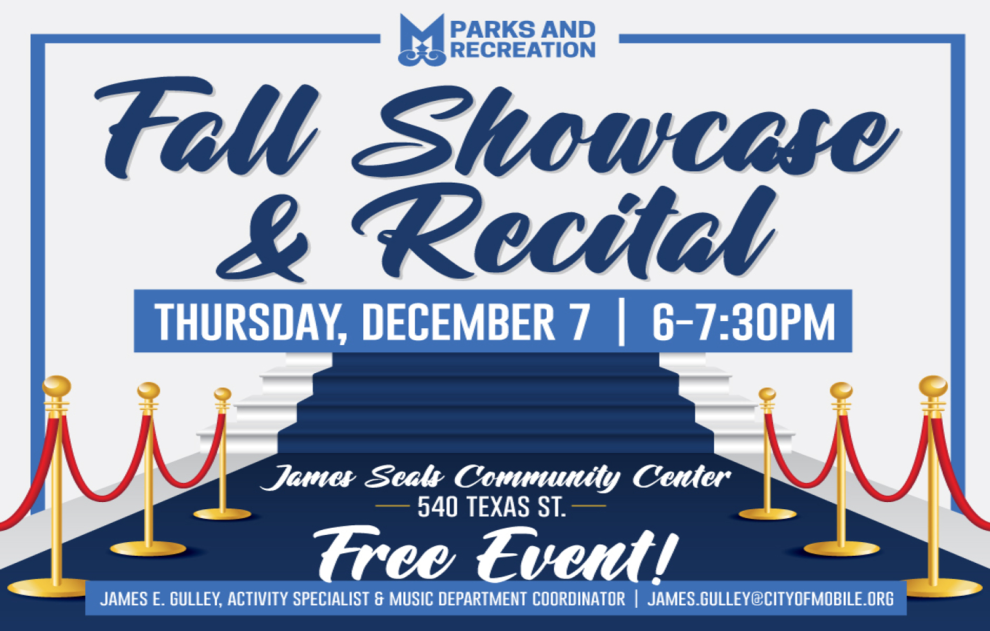 Mobile Parks and Recreation Presents its Fall Showcase and Recital on Thursday, Dec. 7, 2023, from 6 until 7:30 p.m. at James Seals Community Center. This event is free! For more information, please visit: facebook.com/events/s/fall-showcase-and-recital/354072233958109/