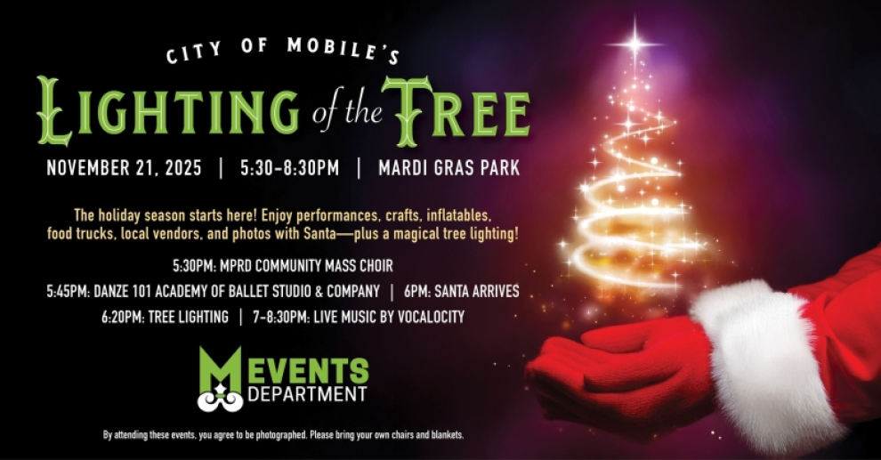 Experience the magic of the season at the City of Mobile's annual Lighting of the Tree celebration on Friday, Nov. 21, from 5:30 to 8:30 p.m. at Mardi Gras Park. Get ready for a FREE evening of festive fun with local vendors, delicious food trucks, holiday crafts, games, inflatables and a special visit from Santa Claus himself. Attendees are welcome to bring chairs and blankets to sit on while enjoying the performances and ceremony.