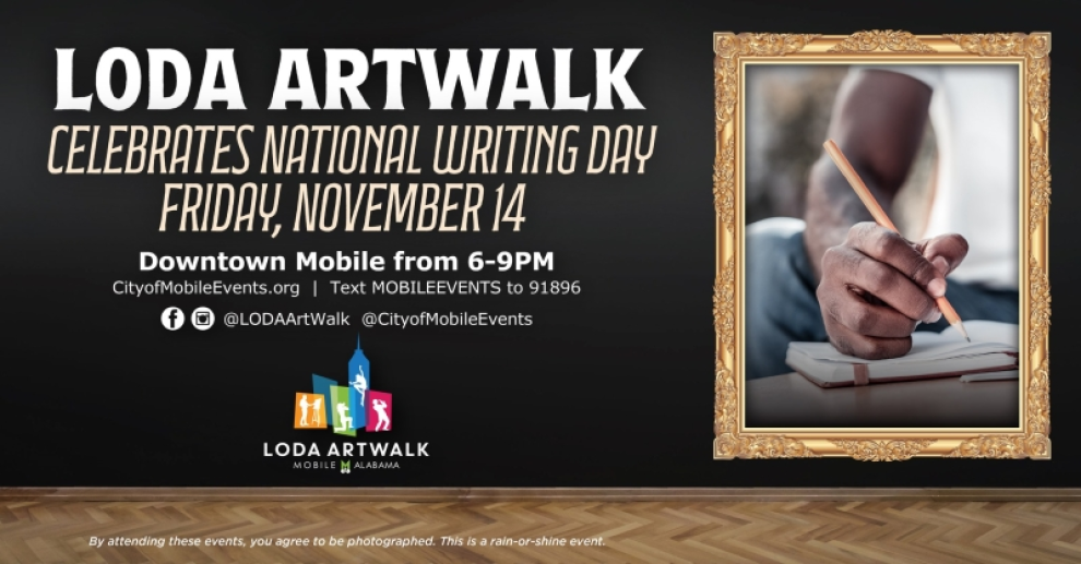 Lower Dauphin (LODA) ArtWalk, a FREE monthly event that showcases Mobile's visual, performing and culinary arts community, takes place on Friday, Nov. 14, from 6 to 9 p.m. The theme changes every month, and November is dedicated to National Writing Day. Visitors are invited to explore local vendors, enjoy live music and admire captivating art along Lower Dauphin Street, which is closed to traffic. There'a also a Kids' Zone where children can make crafts and play games. For more information, go to www.facebook.com/events/1131213435578231 or www.cityofmobile.org/events.