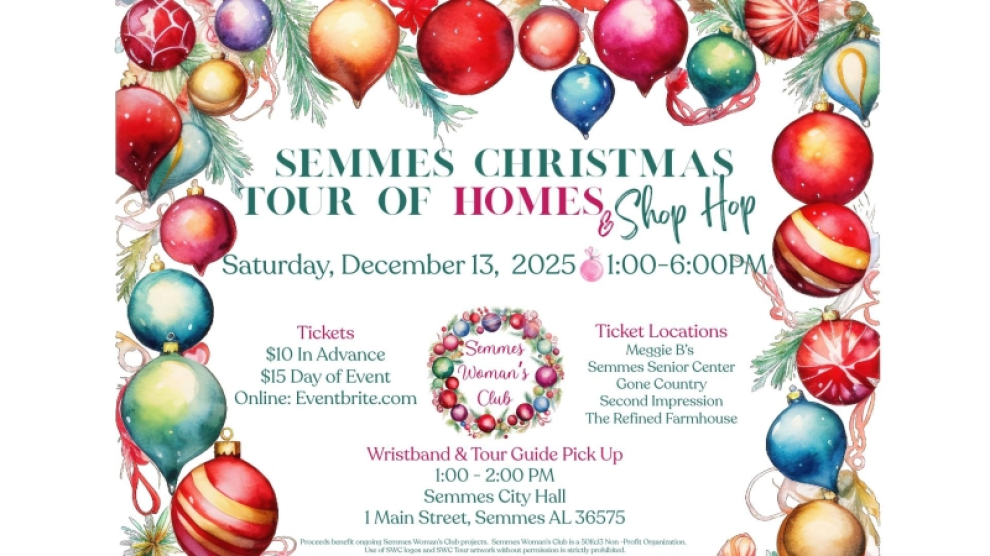 The Semmes Christmas Tour of Homes & Shop Hop, a 16-year holiday tradition, will be held on Saturday, Dec. 13, from 1 to 6 p.m., starting at City Hall. Guests will receive a wristband and printed tour guide from 1 to 2 p.m. The self-guided tour lists homes and shop hops in a suggested route, but guests are free to visit the beautifully decorated homes, retail shops, businesses, city park and landmark sites at their leisure.