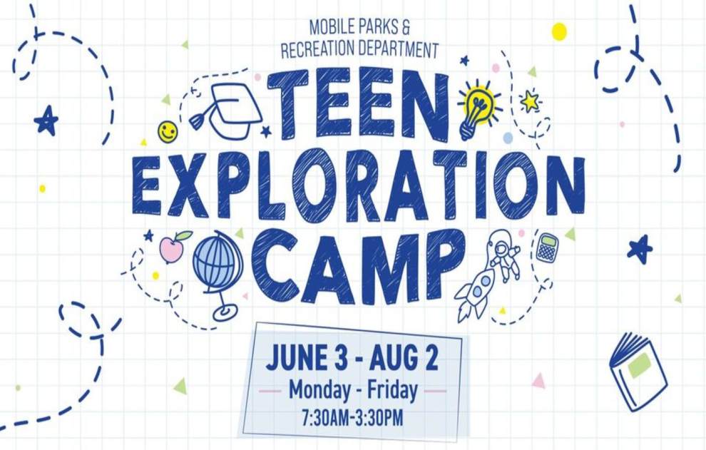 Teens can explore at the Teen Exploration Camp hosted by Mobile Parks & Recreation, Monday, June 3 through Friday, Aug. 2, 2024, from 7:30 a.m. to 3:30 p.m. at the Spring Hill Community Center. They will enjoy a summer filled with art, music, fitness, and STEM! Participants ages 13 to 15 will also visit local colleges, prep for the ACT, learn about careers, go on field trips, and more! For more information, visit here: facebook.com/events/1382504505739533