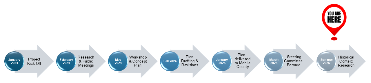 The master planning project kicked off publicly in January 2024 with research and information gathering, which was followed by public engagement events Feb. 21-22, 2024, and a charette with concept planning May 16-20, 2024. The master plan was presented publicly on Sept. 4, 2024. The plan was refined and delivered to the Mobile County Commission in January 2025.