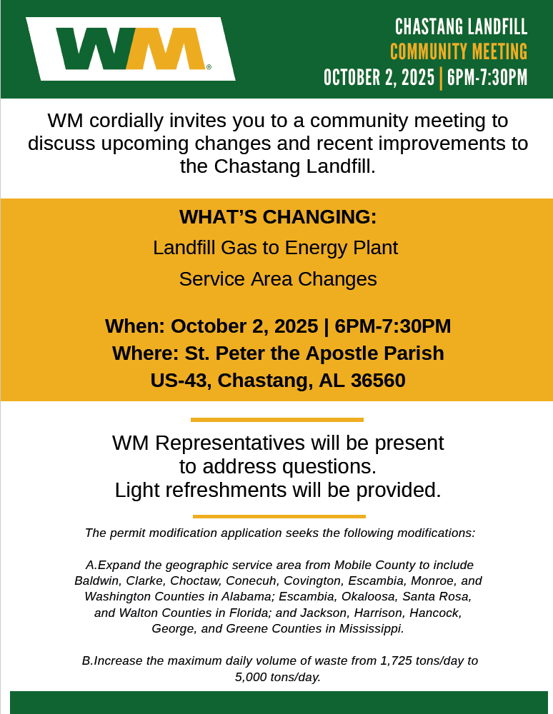 See below for information on the Oct. 2 public awareness session about the application for local approval to expand service area and daily intake volume at the Chastang Landfill in north Mobile County. This event is organized and hosted by the applicant.