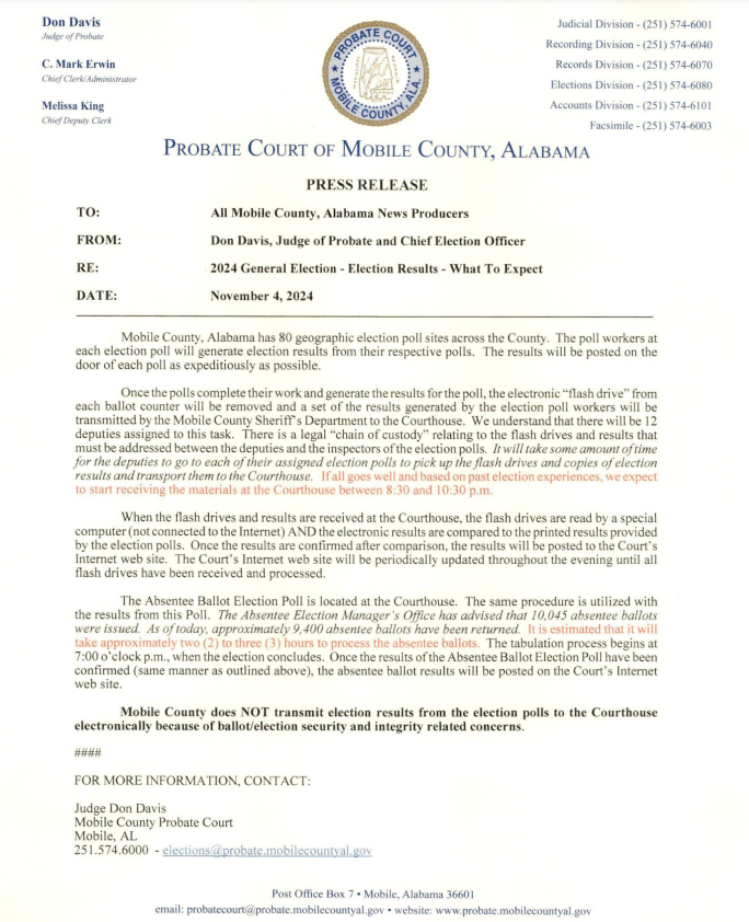 2024 General Election - Election Results - What To Expect: Announcement from Probate Judge Don Davis, Chief Elections Officer for Mobile County