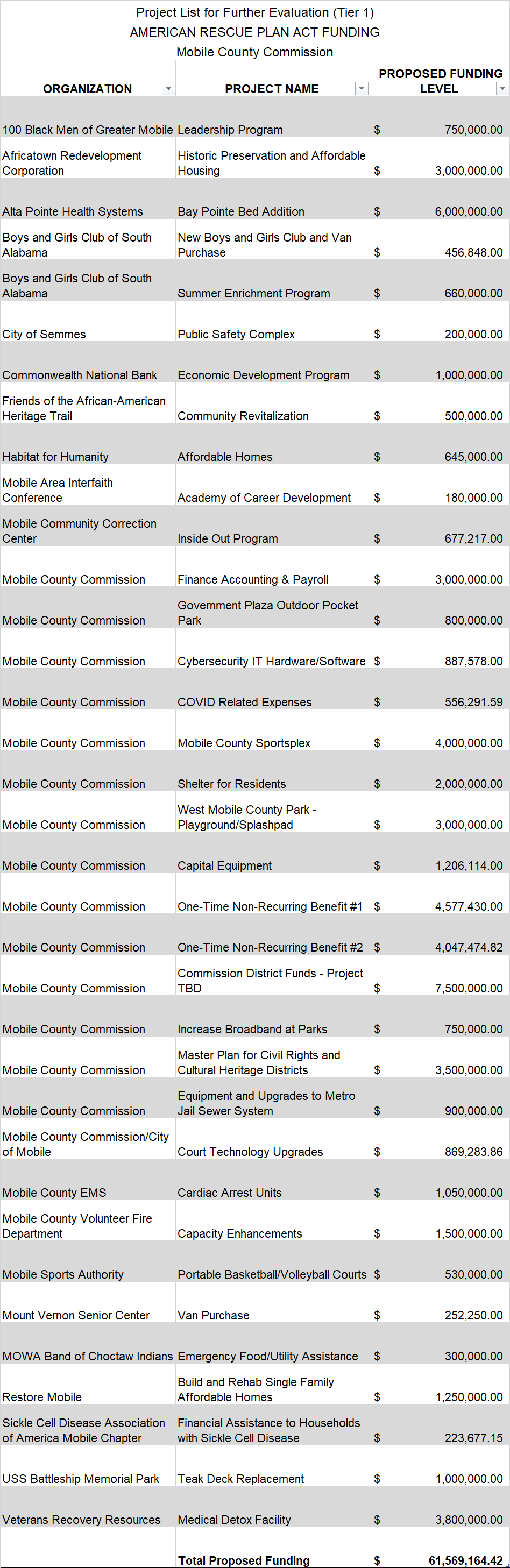MOBILE COUNTY, Ala. – The Mobile County Commission approved a list of American Rescue Plan Act (ARPA) funding proposals at its meeting on April 21 allowing 35 projects totaling $61.5 million to move forward to the next phase of its selection process.