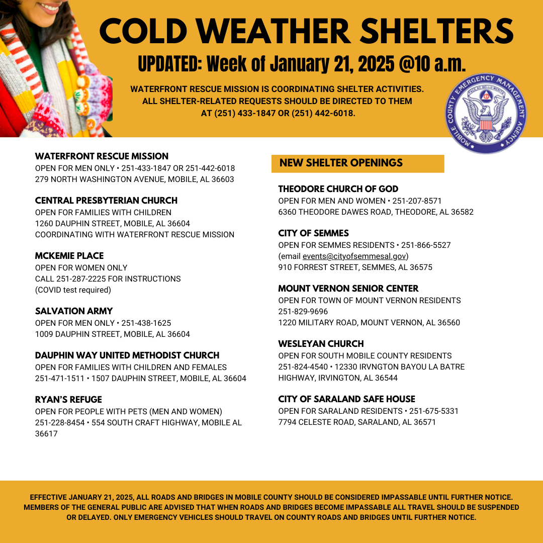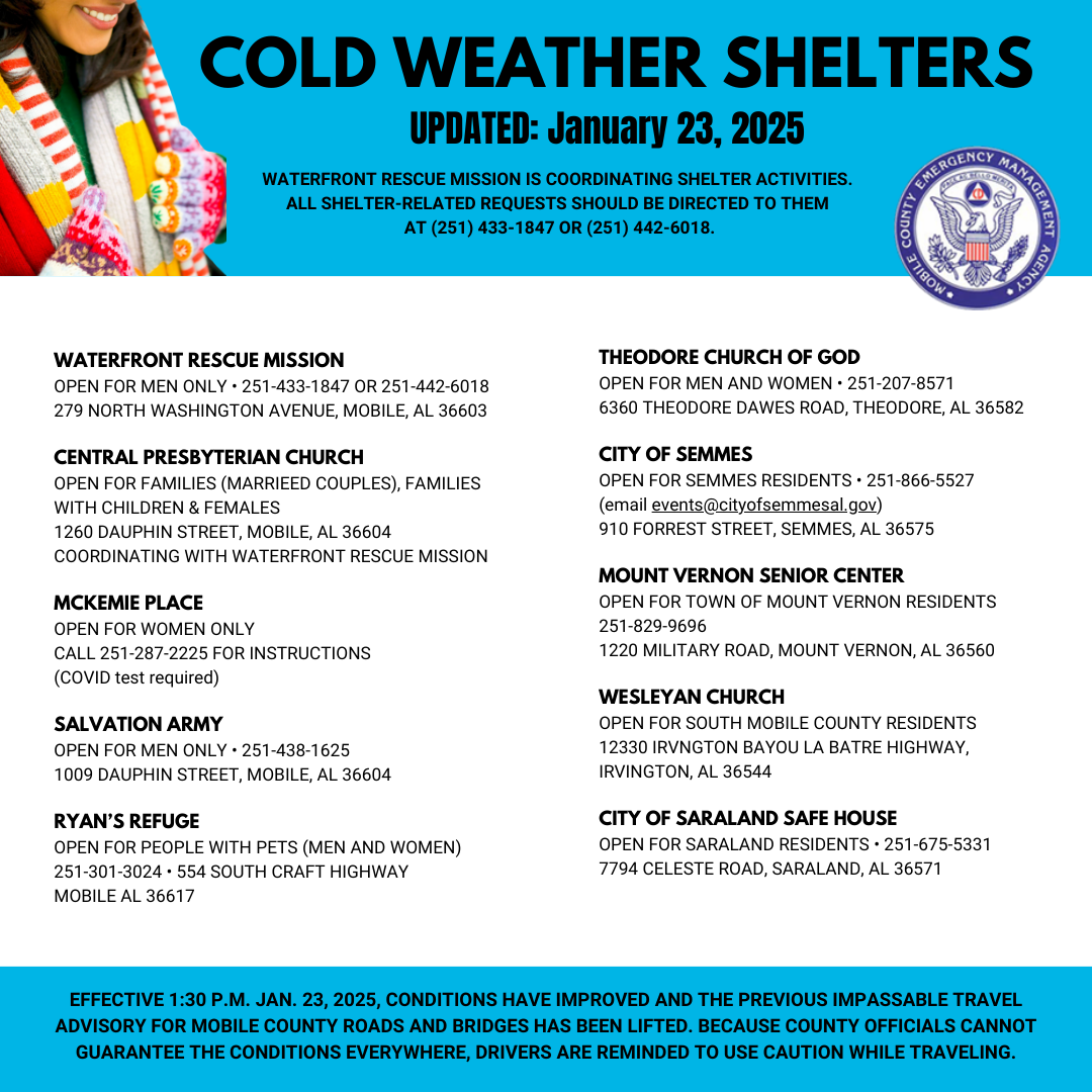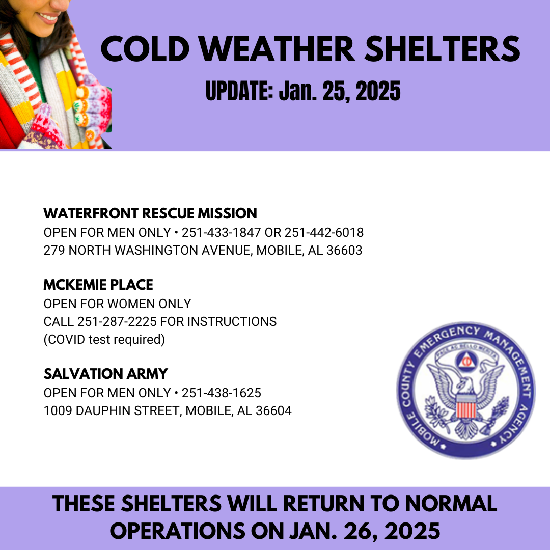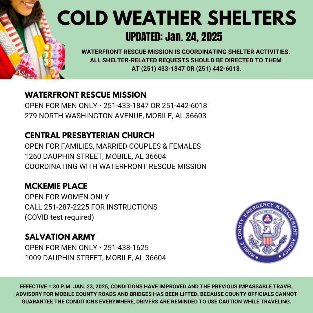 Jan. 23, 2025 update on cold weather shelters open in Mobile County: