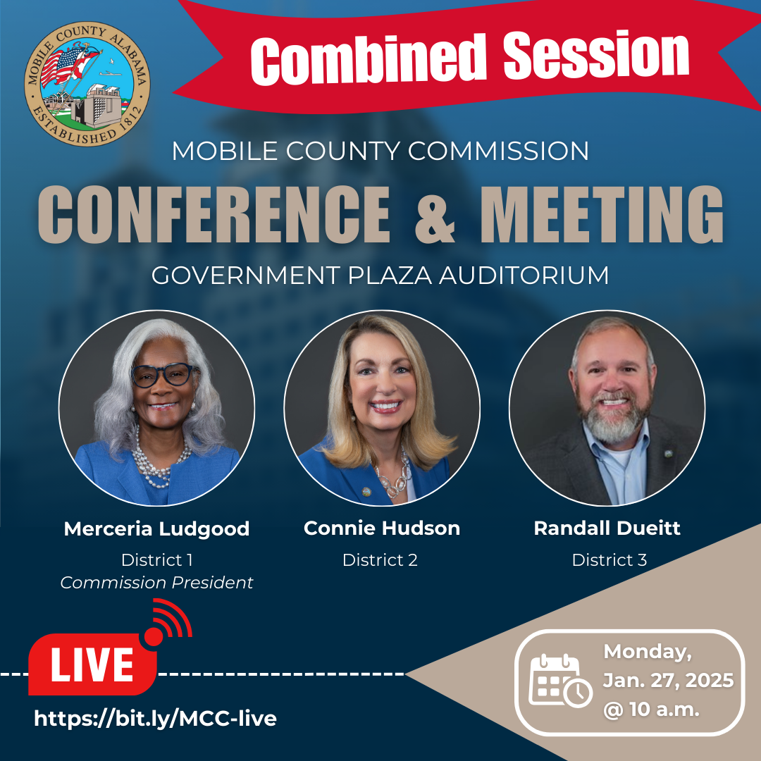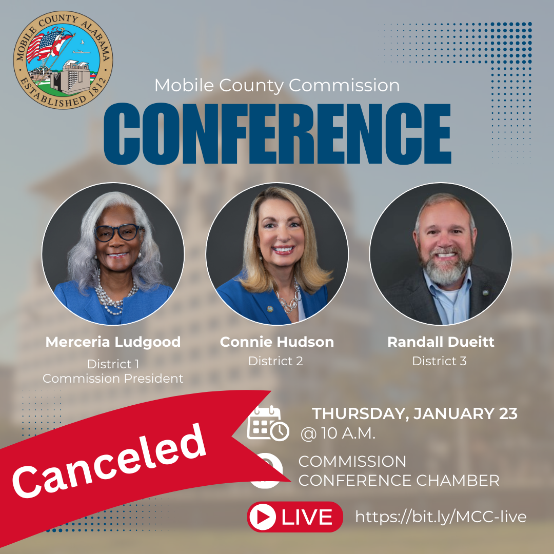 MOBILE COUNTY, Ala. – Due to this week’s winter weather and closure of Mobile County Commission offices, the Mobile County Commission Conference (work session) that was scheduled for Thursday, Jan. 23, 2025, has been canceled and combined with its next regular Meeting. The Mobile County Commission will meet next on Monday, Jan. 27, 2025, at 10 a.m. for a combined Conference and Meeting.