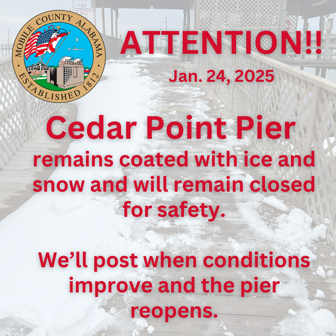MOBILE COUNTY, Ala. -- Jan. 24, 2025: Cedar Point Pier remains closed for safety. There's just too much ice on the pier. We'll post when conditions improve and the pier reopens.