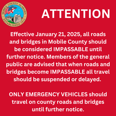 Effective January 21, 2025, all roads and bridges in Mobile County should be considered IMPASSABLE until further notice. Members of the general public are advised that when roads and bridges become IMPASSABLE all travel should be suspended or delayed. Only emergency vehicles should travel on county roads and bridges until further notice.