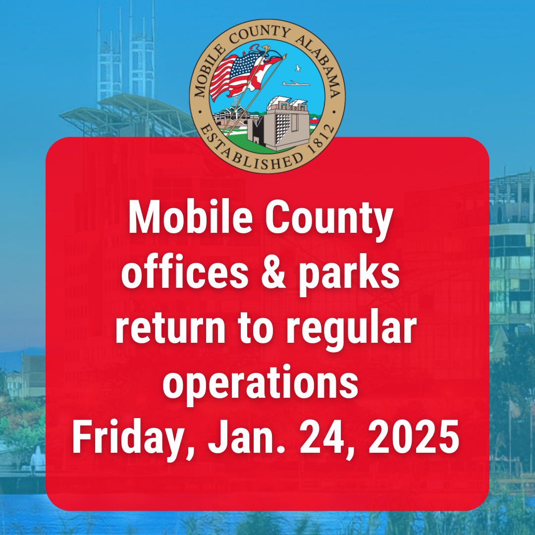 MOBILE COUNTY, Ala. – Mobile County offices and parks resume regular operations tomorrow, Friday, Jan. 24, 2025.