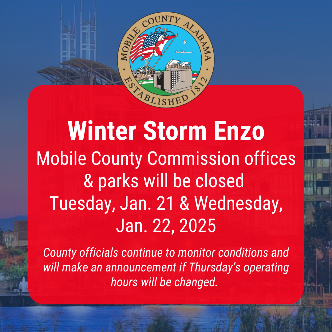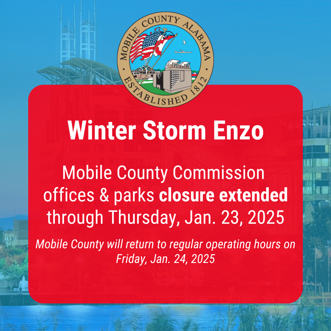 MOBILE COUNTY, Ala. – The Mobile County offices and parks closure announced on Jan. 19 has been extended through Thursday, Jan. 23. We will return to regular operations on Friday, Jan. 24, 2025.