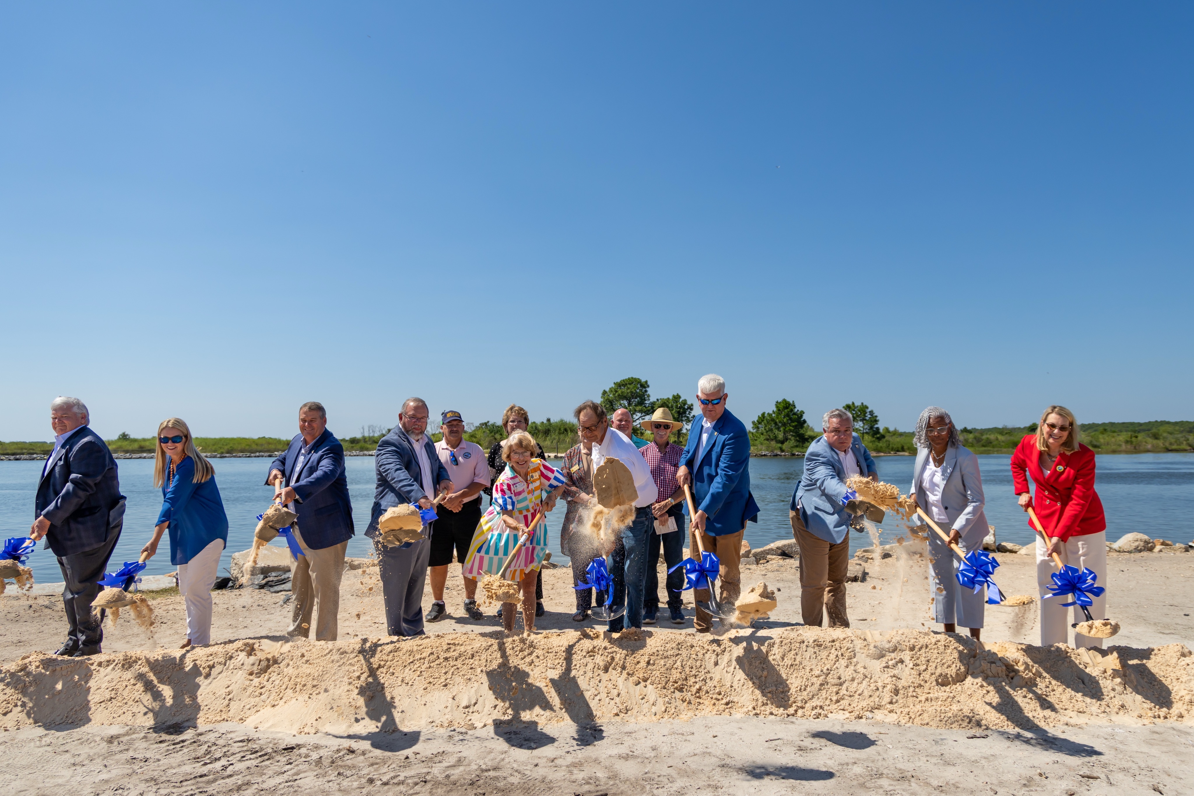 Groundbreaking participants: ADCNR Commissioner Chris Blankenship, State Senator David Sessions, State Representative Chip Brown, Mobile County Commissioners Randall Dueitt, Connie Hudson, and Merceria Ludgood, Bayou La Batre Mayor Henry Barnes, Meg Goeker of Moffatt Nichol, Ben Radcliff of Radcliff Construction, and Bayou La Batre City Council representatives.