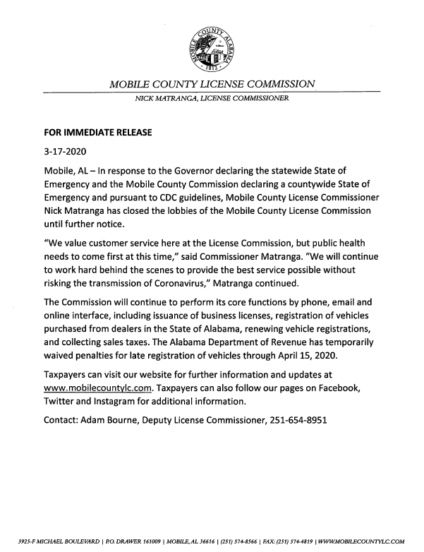 COVID-19 ANNOUNCEMENT: Mobile County License Commission will be Closed Until Further Notice