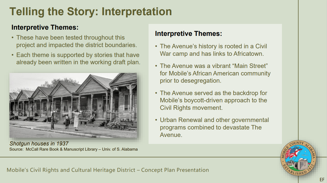 Suggested storytelling themes of the new Civil Rights & Cultural Heritage District centered on the historic Avenue in Mobile: