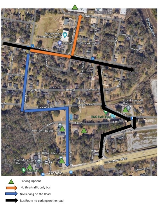 Winbush and Edwards streets near Africatown Heritage House and the Robert L. Hope Community Center will be closed to through traffic on Community Day. Parking has been arranged at the following locations with small City bus and golf cart shuttles to/from the celebration site: