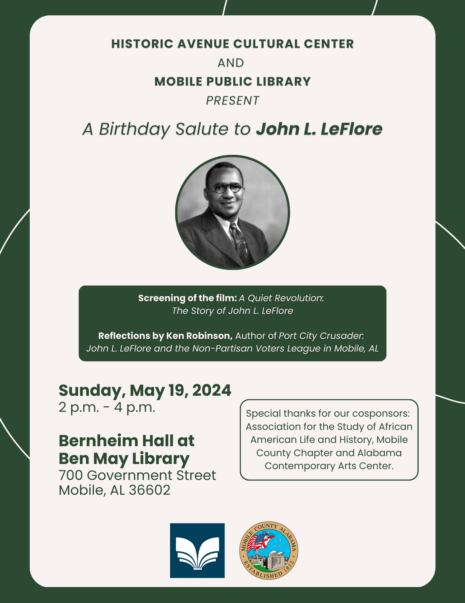 The Historic Avenue Cultural Center has teamed up with the Mobile Public Library to celebrate one of Mobile’s most influential Civil Rights leaders, John L. LeFlore, on his 121st birthday. On Sunday, May 19, from 2 to 4 p.m., the public is invited to honor LeFlore and his legacy with a screening of the documentary film, A Quiet Revolution: The John L. LeFlore Story, at the Ben May Main Branch’s Bernheim Hall.