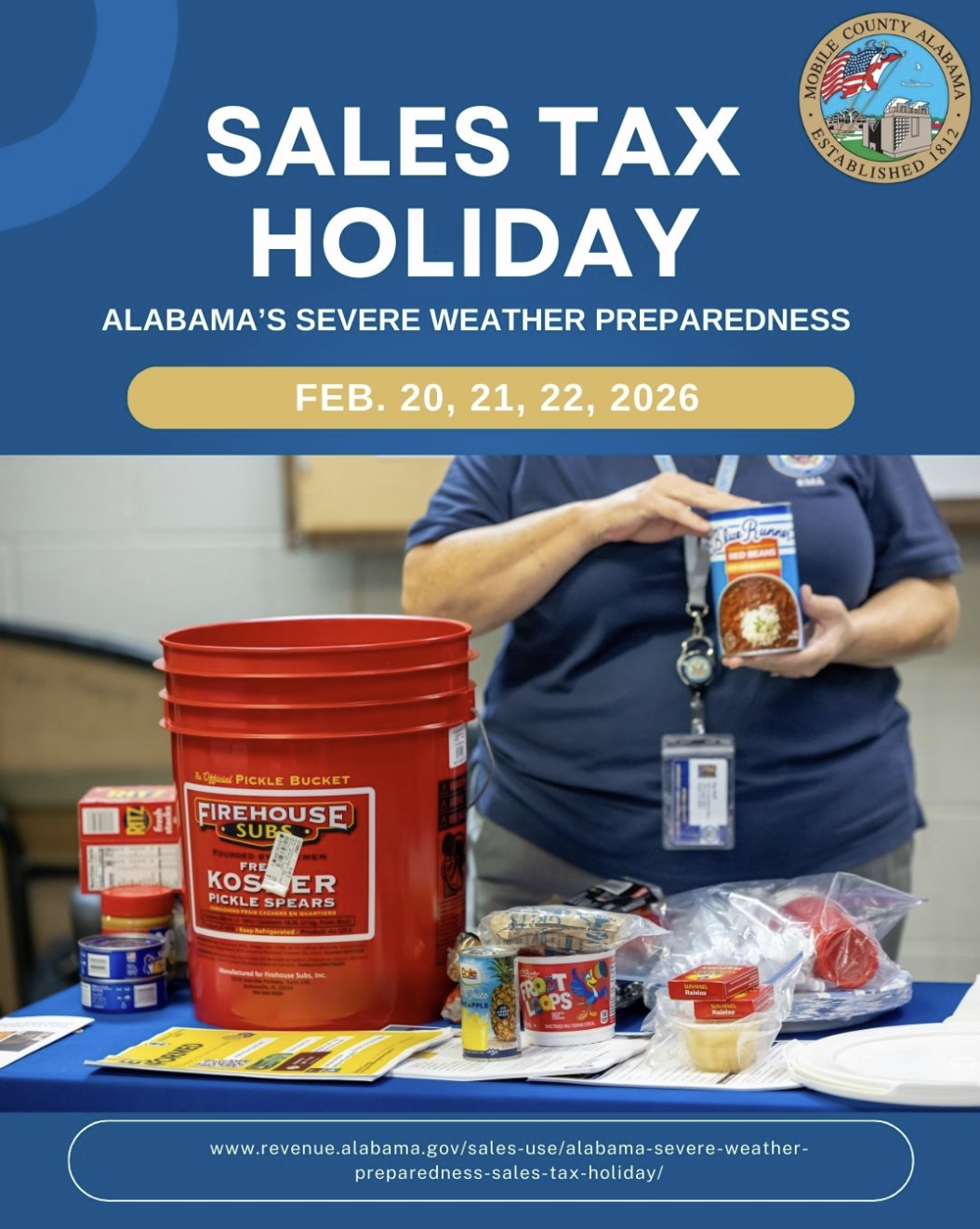 MOBILE COUNTY, Ala. — Alabama’s Severe Weather Preparedness Sales Tax Holiday, held the last full weekend in February, will begin 12:01 a.m. Friday, Feb. 20, 2026, and ends 11:59 p.m. Sunday, Feb. 22, 2026.