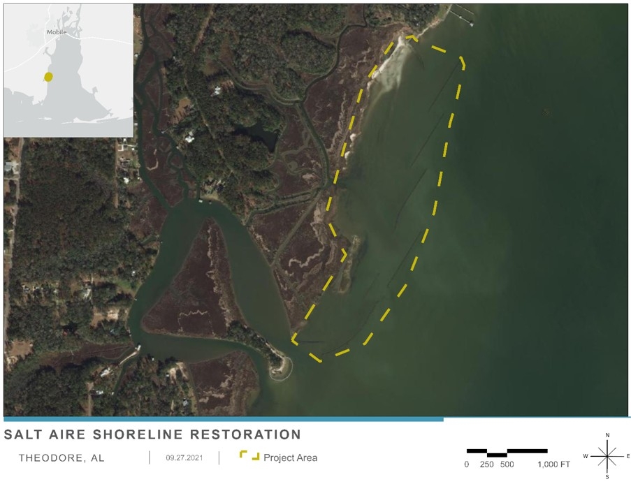 The Salt Aire Shoreline Restoration Project will restore approximately 30 acres of marsh and help stabilize a portion of the western Mobile Bay shoreline that has experienced decades of erosion. Healthy marsh habitat supports fisheries, wildlife, and the working waterfront, while serving as a natural buffer against everyday wave action and coastal storms.